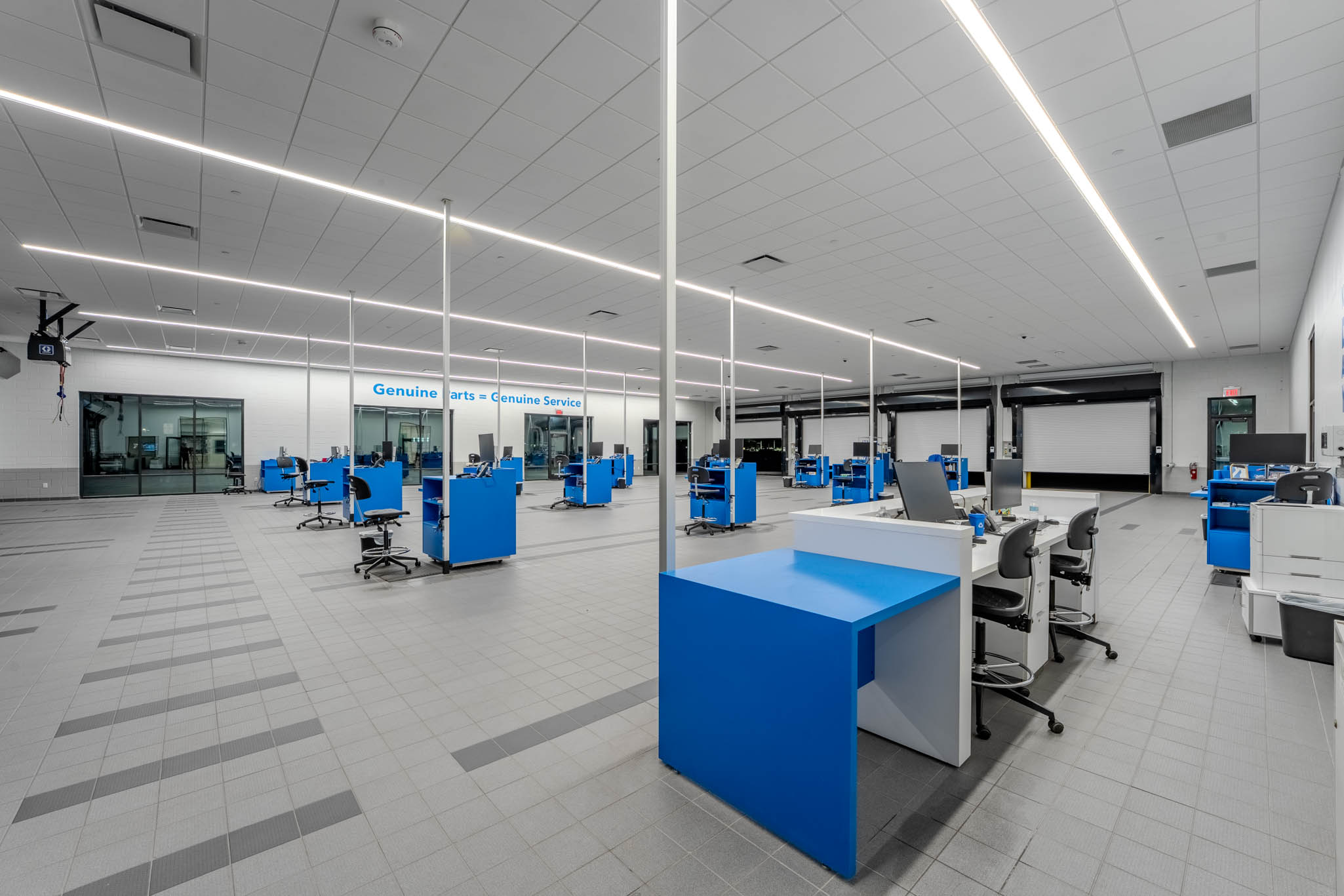 The renovation and expansion modernize the existing facility to support both operational efficiency and customer comfort. The project includes a new showroom layout, restrooms, customer lounge, café, outdoor space, sales and tech lockers, and upgraded finishes throughout the building. Functional improvements include 51 service bays, a 12-vehicle service reception, 5 new vehicle delivery bays, and 8 F&I offices. The redesigned service drive enhances circulation and workflow, while the expanded showroom provides a brighter, more welcoming environment.